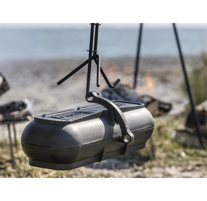 Wanneer de aardappelpoffer in het vuur ligt kun je hem met een deksellifter en de handige ring aan het sluitingsmechanisme gemakkelijk uit het vuur halen, zodat je veilig kunt genieten van heerlijke gepofte gerechten.